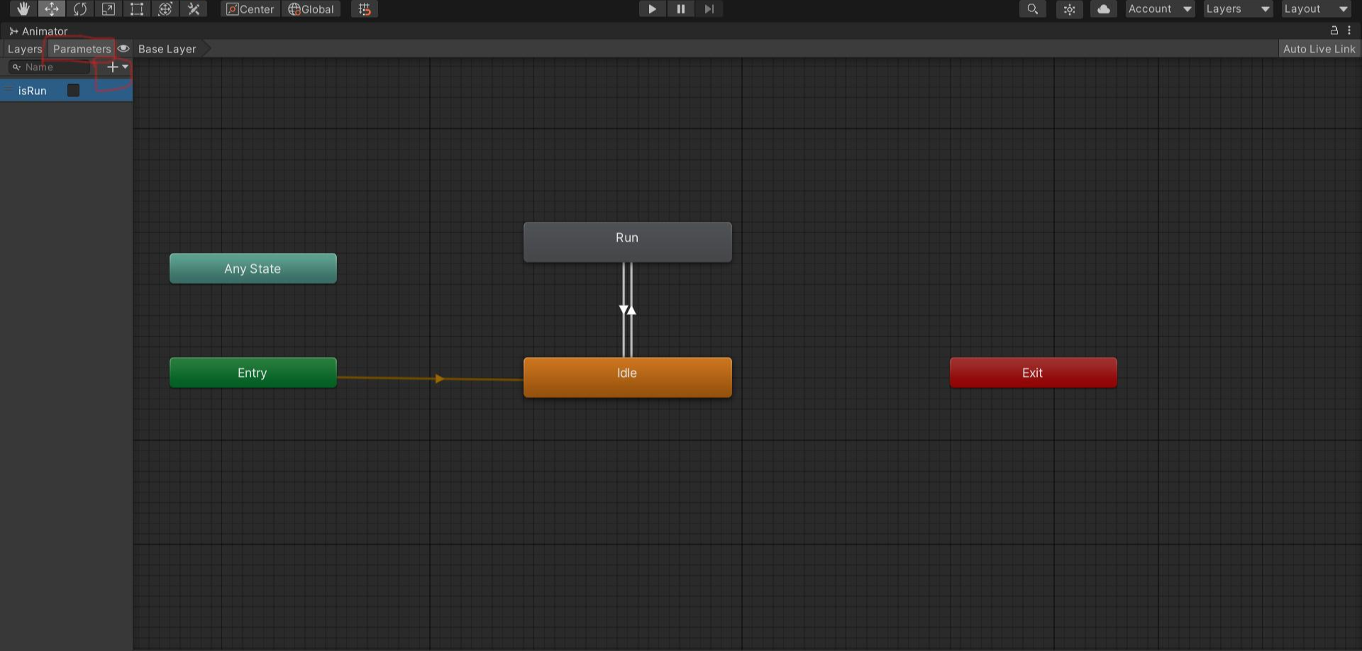 이제 Idle 에서 Run 으로가는 트렌지션을 하나 클릭한다음에 Conditions 항목에 있는 + 버튼을 누르고 우리가 만든 isRun 변수를 만든후 [idle] -> [Run]으로갈때는 true로 [Run] -> [idle] 로갈때는 false로 설정해주면된다