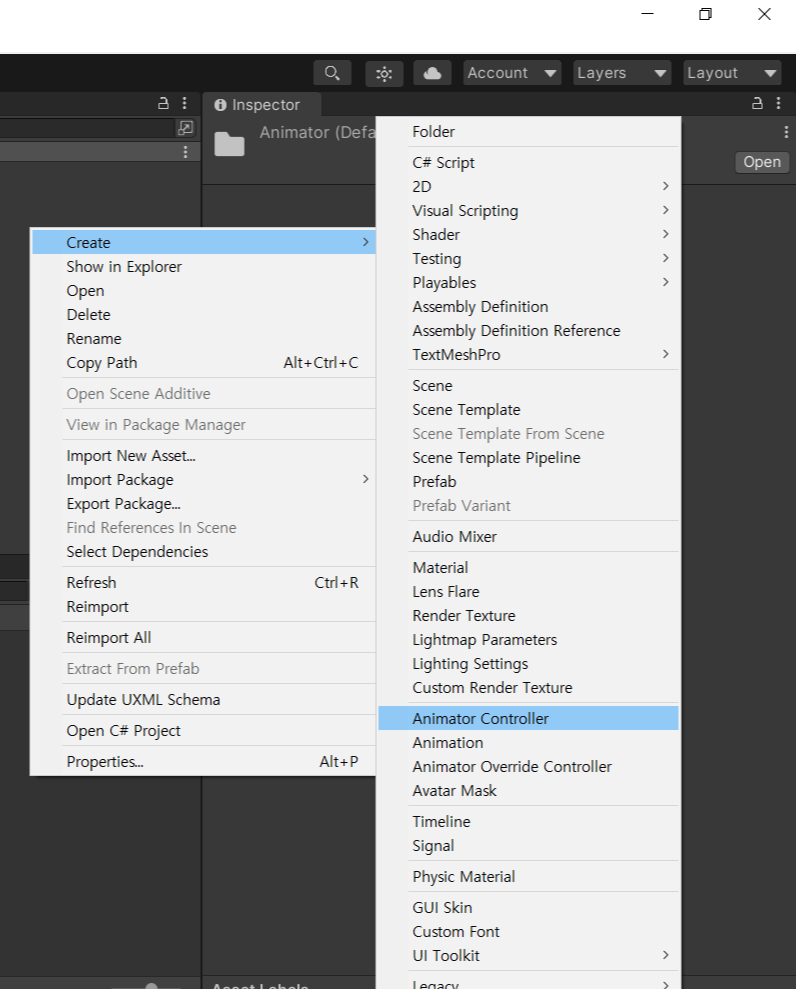 이제 애니메이션 컨트롤러를 만들면 해당화면이 보일것이다
