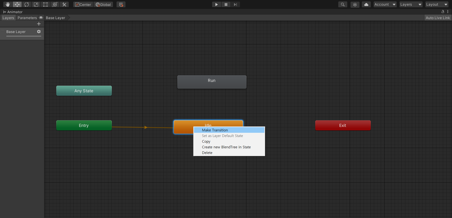 이제 우리는 애니메이션의 전환을 위해 트렌지션을 만들어야한다 애니메이션을 하나 우클릭한다음 Make Transition 을 클릭하면 연결시킬수있는 선이 생긴다 해당 선을 변경시킬 다른 애니메이션 노드에 연결하면된다