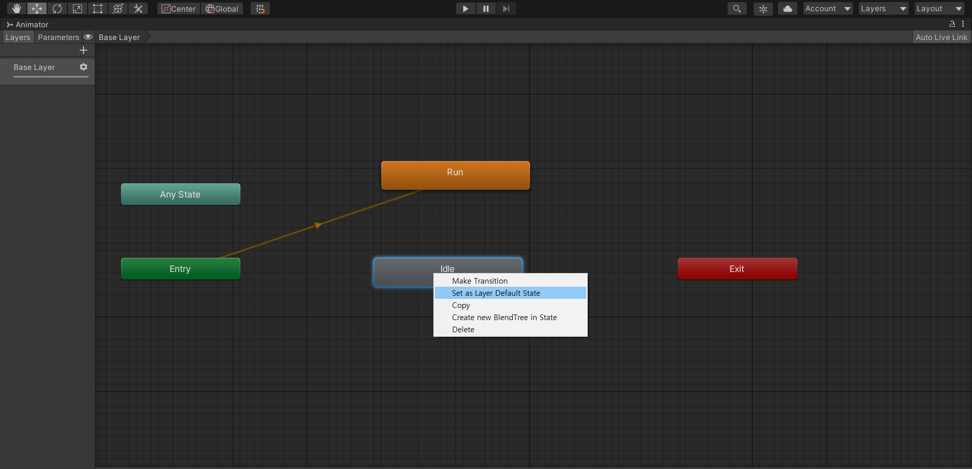 Entry노드는 애니메이션의 시작지점에 해당하는 노드이다