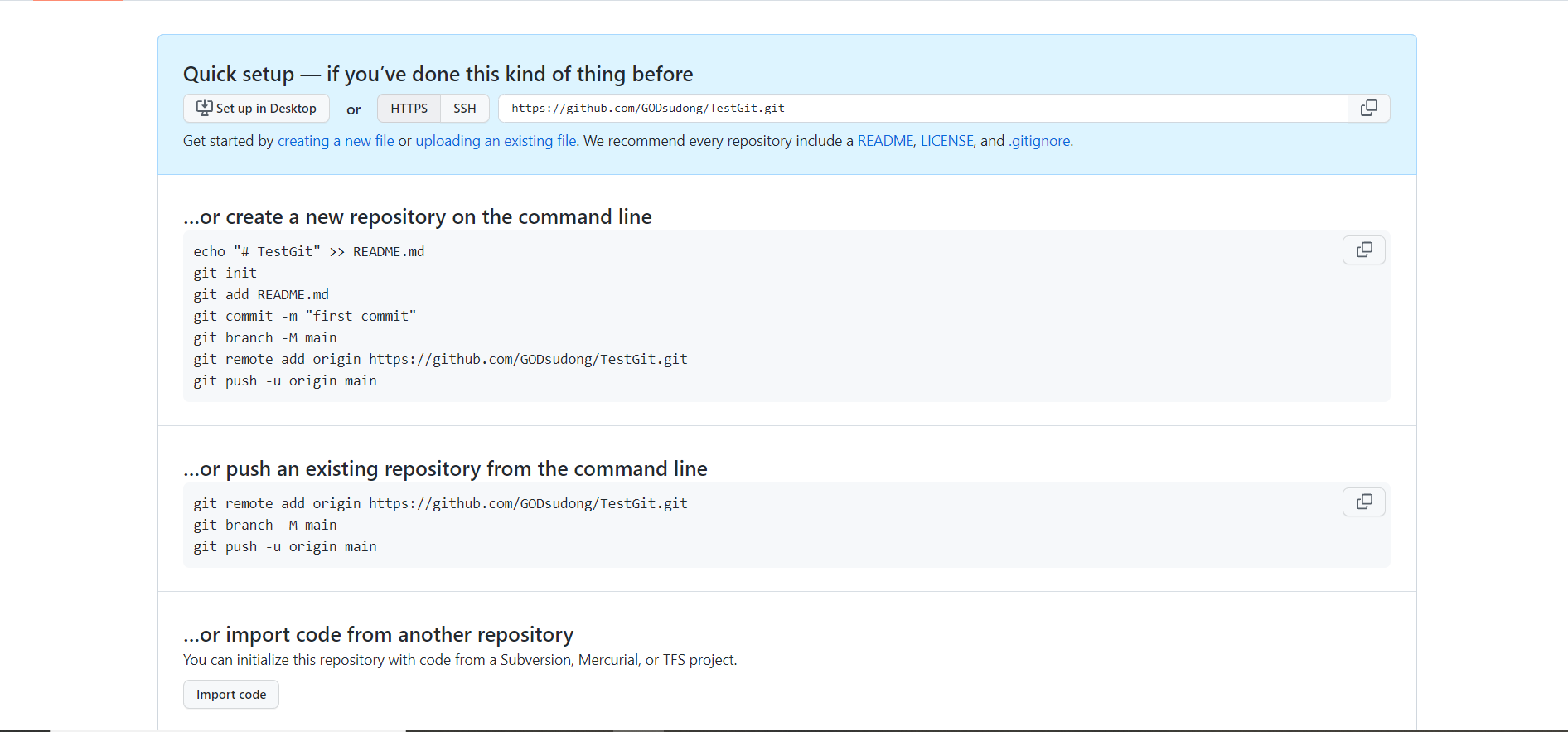 저장소를 생성하면 위와 같은 모습이 될 텐데 이제 우리가 명령 프롬프트에서 우리가 업로드를 할 폴더로 이동을 하여 파일을 추가해줘야 합니다 우리가 어떻게 해야 될지는 친절하게 설명해주는데요 우선 새로운 파일을 만들 경우는 1번째를 따라 명령 프롬프트에 복붙을 해주면 되고 기존에 로컬 저장소에서 git 작업을 해두고 github에 push만 하면 되는 경우는 2번째 명령어를 입력해주면 됩니다
