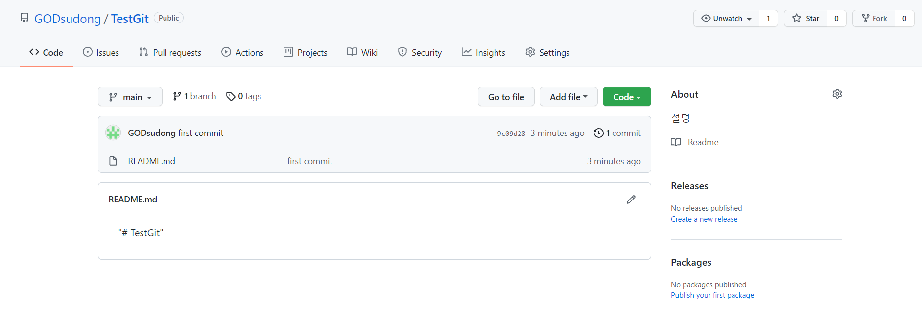 새로만든 README.md 파일도 올라가있고 커밋 내용인 first commit도 정상적으로 처리되어있는 모습을 볼 수 있습니다