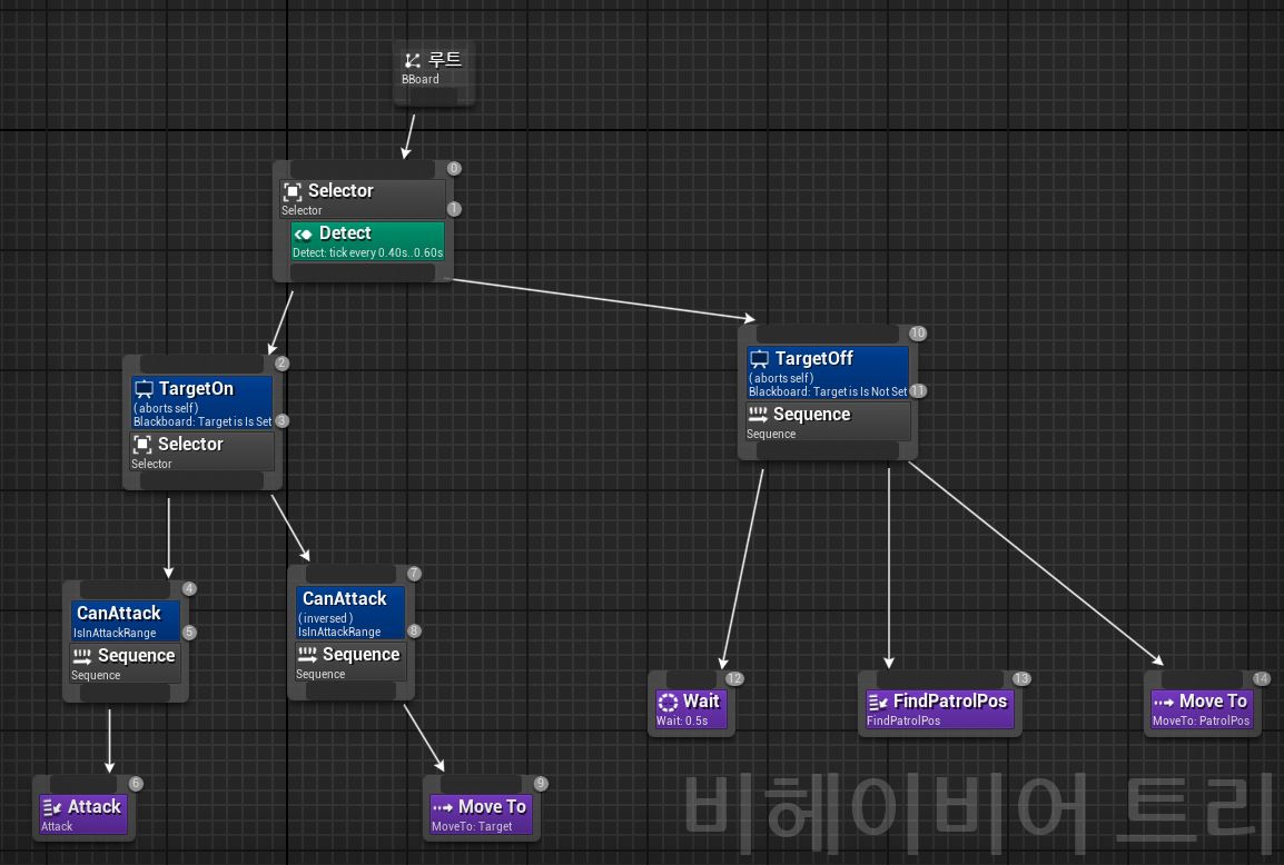 BehaviorTree 는 언리얼에서 인공지능을 좀더 효율적으로 다루기 위해 여러 간선으로 이루어진 AI시스템입니다 애니매이션을 다룰때 사용했던 상태머신과 비슷한 개념으로 이해하시고 글을 읽으면 도움이 되실거라 생각됩니다