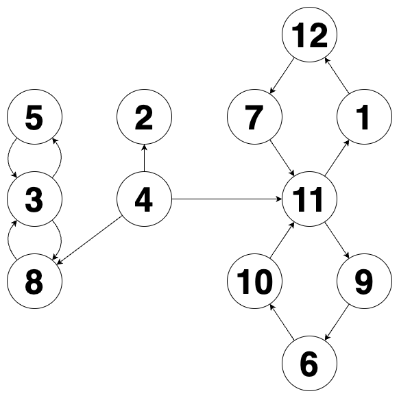 입력 [[4, 11], [1, 12], [8, 3], [12, 7], [4, 2], [7, 11], [4, 8], [9, 6], [10, 11], [6, 10], [3, 5], [11, 1], [5, 3], [11, 9], [3, 8]]