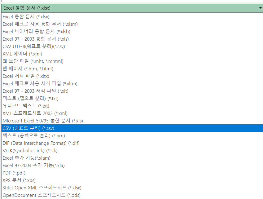 이렇게 Excel 파일은 만든다음 다른이름으로 저장을 눌러 CSV파일로 저장을 하면 된다